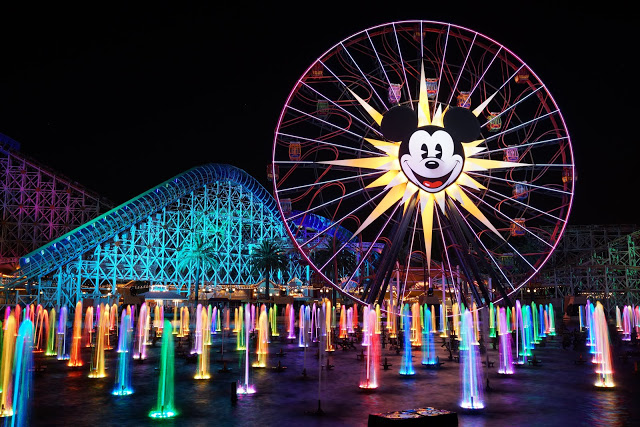 The heat and fun had secretly been sapping their energy all day, and when they sat down to rest, it pounced outright. At this comma in the day, B went off to take pictures and AJ and the boys stopped at a cool little food shop for dessert. The family met up with B on a deck like structure by the lake and waited for the sun to disappear for the nightly World of Color show.