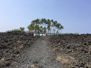 Once parked amongst 4WD, high-sitting vehicles, they loaded up with essentials, then walked along a trail, the dry heat and burnt smell radiating from the lava fields surrounding them. The family paused at a pleasant beach with a few abandoned structures, but didn’t stop at the picturesque place. A copse of elegant palms held their attention as the boys crawled over larger lava rocks. A black goat made an appearance, coming in and out of view as they walked. Past the trees, the trail opened to a rough path of slightly smoothed lava rock for 1/4 mile of ankle turning, hot, but not dusty hiking. The lava rocks rattled like broken pieces of crockery beneath their feet.