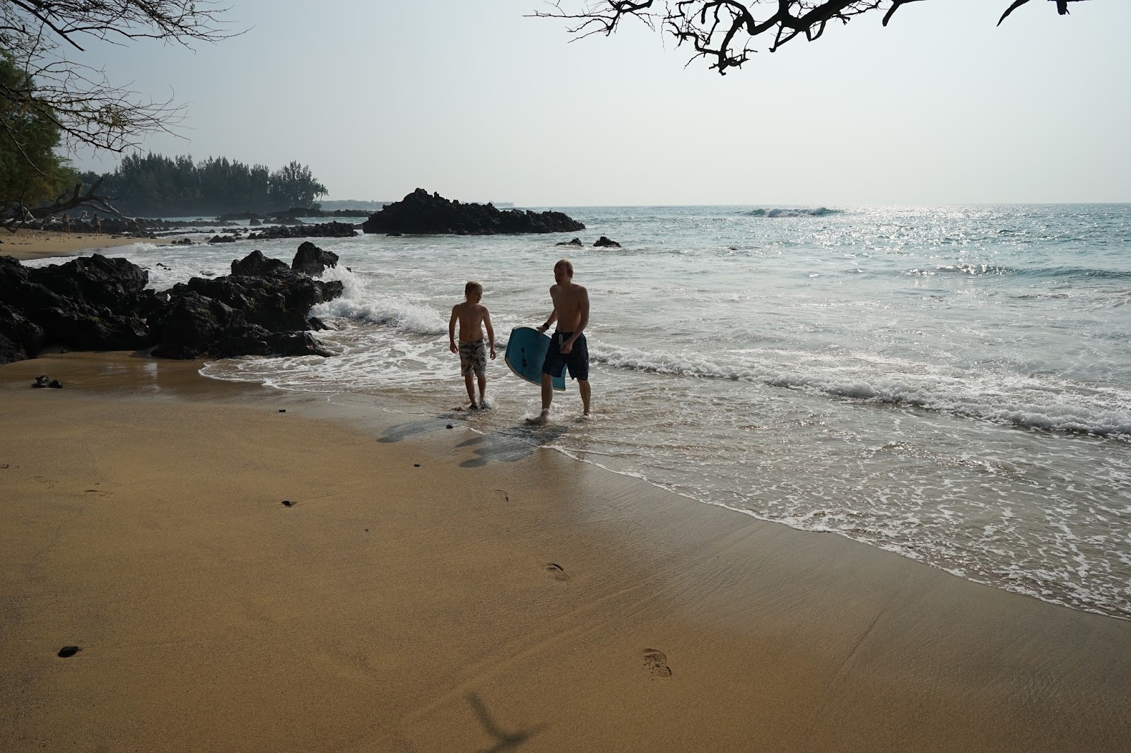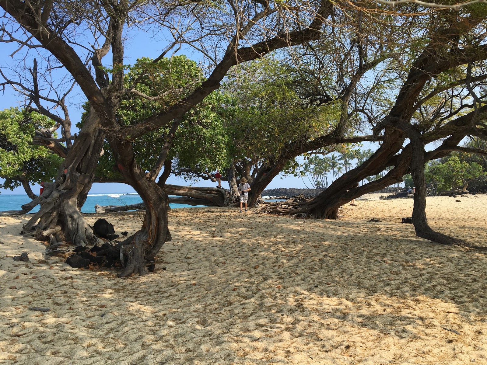 And this family was no different. It was a slow start. After lunch, they wandered to Beach 69 (Waialea Beach), which was once a military training ground, apparent by signs warning them there may be “undetonated ordnances” and if found, do please call 911 immediately. The beach was a sprawling stretch of sand, lined with huge trees stretching their thick limbs toward the ocean, serving as the perfect protection from the strong sun.
