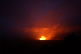 While they ate, the sun snuck down below the horizon, but that was what B was waiting for. There were still sights to see after dark in this National Park. At a turn-off at the end of one of the roads, in the dark, the family followed lighted walks, stopping at a fence that overlooked a vast space of darkness, punctured violently by a huge glowing red light in the distance. It was the volcano, burning, smoking, glowing with the most natural light around.