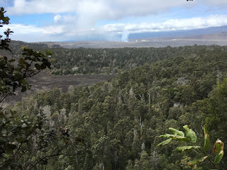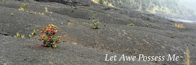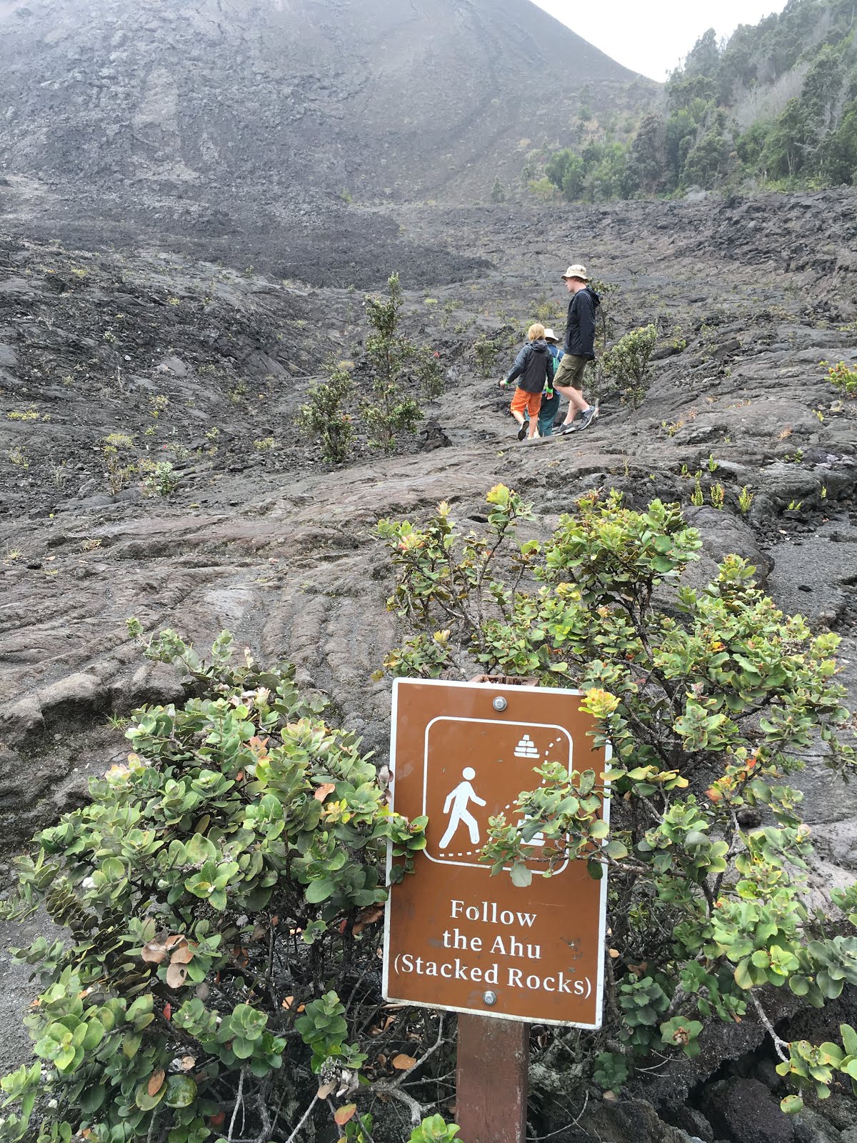 The first two-thirds of the hike was easy, through wooded path, then it crossed a volcanic crater of pahoe’hoe lava. The trail across this hardened flat plain was marked by piles of stones (called ahu). The crater bottom was pocked with struggling plants and steam vents, whose heat originated at unknown depths under the hardened lava. AJ donned and shed her raincoat as the mist grew heavy and light in turn.