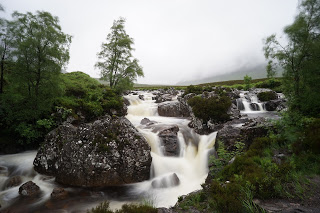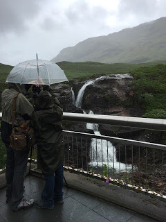 A thirty minute drive brought the family to Glencoe, an area with huge green towering mountains veiled in mist, flanking a picturesque valley dotted with white stone cottages tucked away here and there in the bends of running streams. Heavy mist fell over the area, putting a damper on the best photo shots for B.