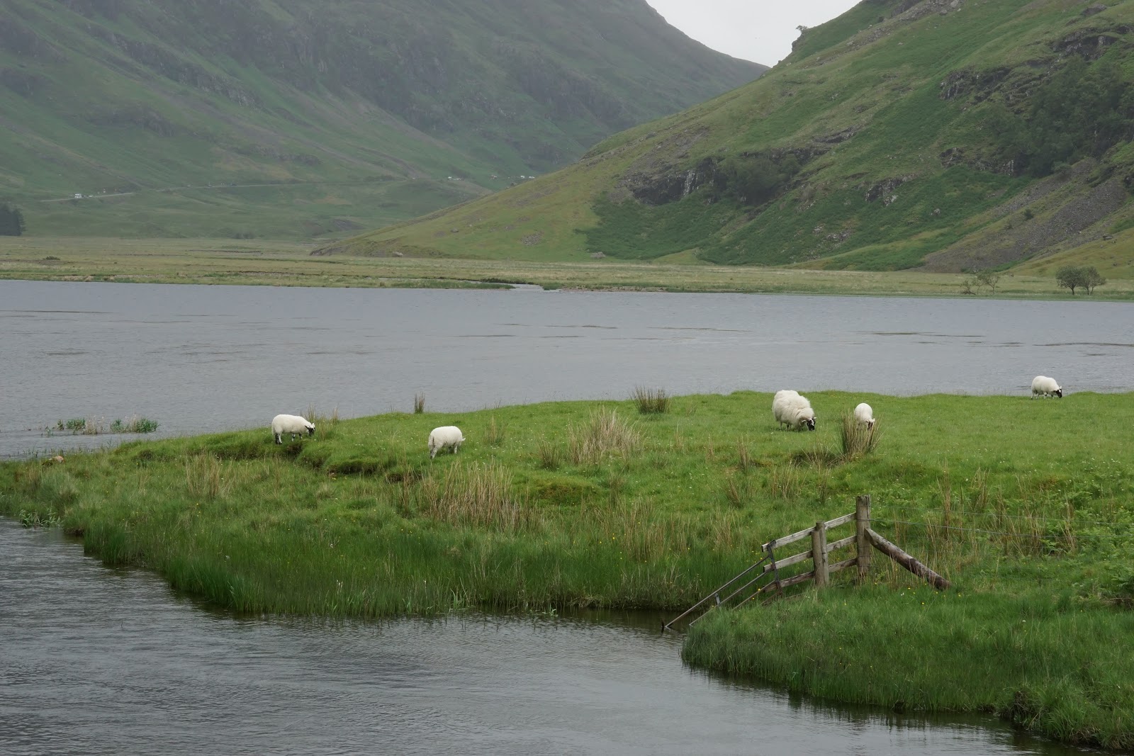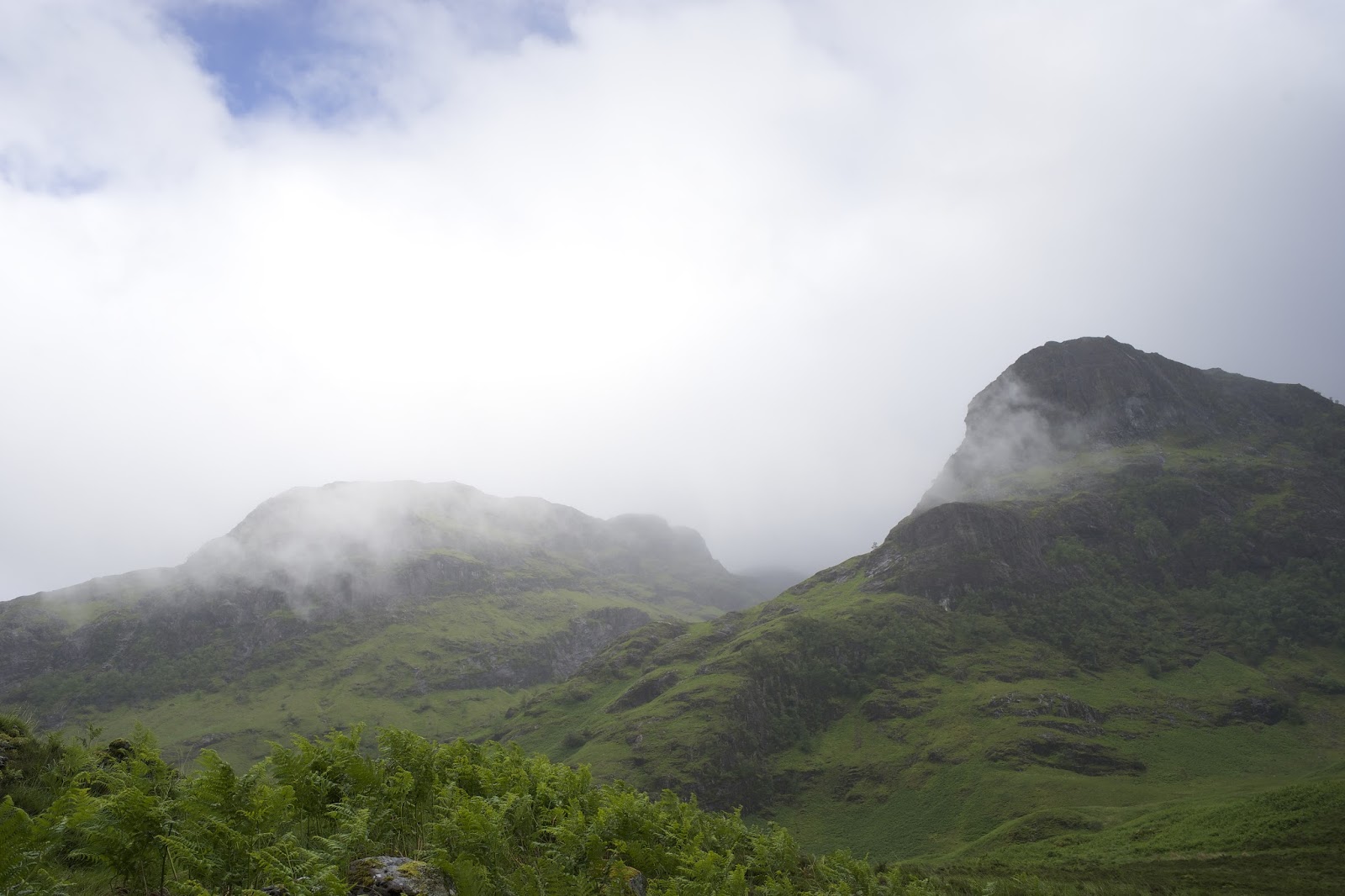The road through Glencoe was curvy and very busy, with speeding cars and big trucks (lorries) and vans and busses and RV’s. The roads weren’t like the roads in the US National Parks where cars crawled past every 10 minutes or so. This made getting on and off the road very tricky. The mountains flanking the road were, in some ways, like so many AJ had seen and grown up around, but in all the important ways, they were different. They were bigger. Wind blew white mist around and over the tops, patches of exposed rocks showed through the green in places and white streaks of jagged white water falls accented the behomoths.