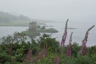 While B tried to get good shots of castle through a dreary grey drizzle of rain, AJ combed the gift shop where she bought a cheap, “I love Scotland” umbrella to keep B’s camera dry. Castle Stalker is a restored castle in the middle of a tidal islet (only accessible when tides are low). The existing structure, built in the 1400s, changed hands many times, some of those hands being of the Campbell and Stewart families, until it was bought and restored by the present owners.