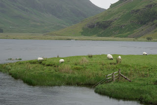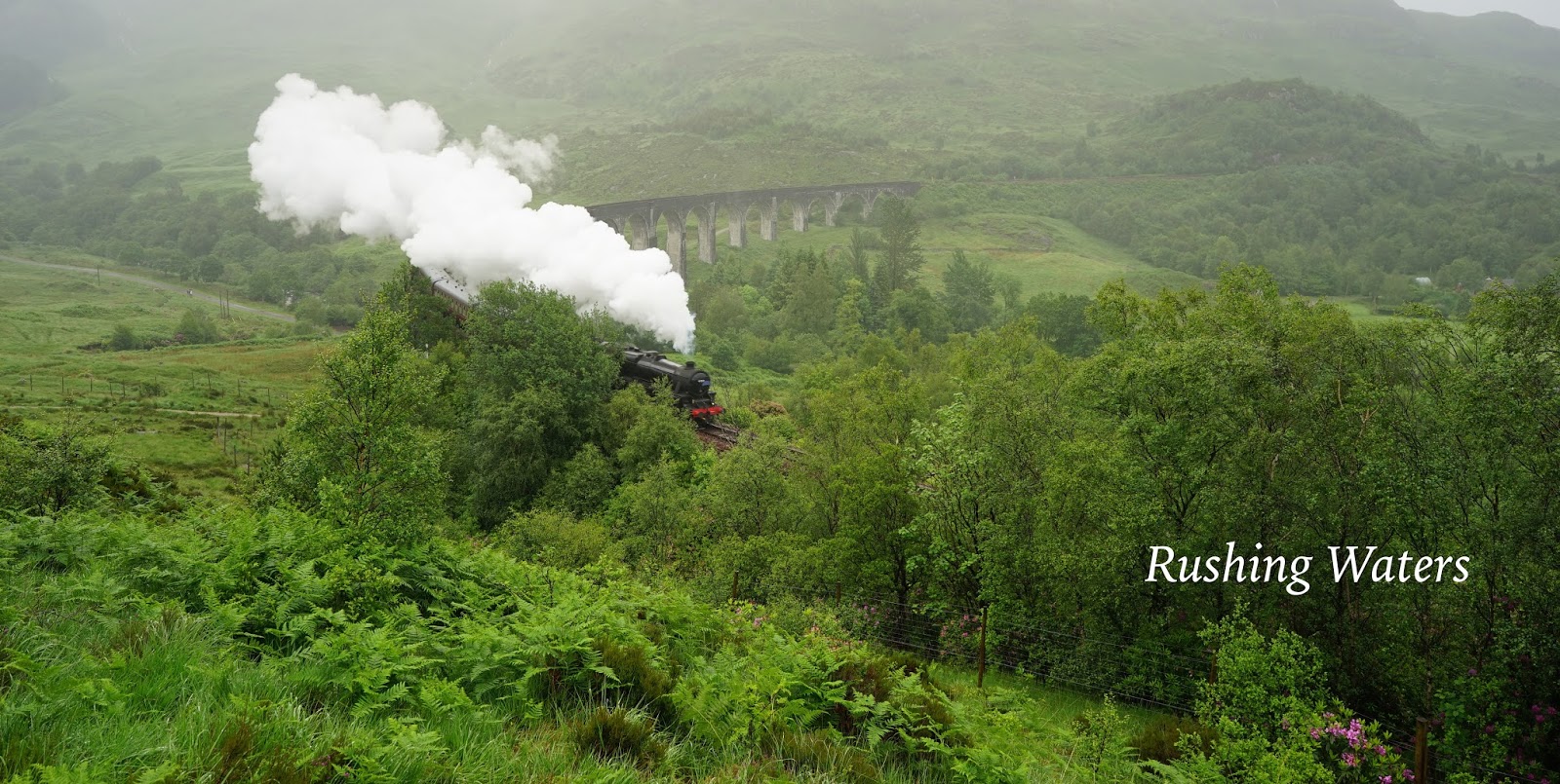 Parking in a small, crowded gravel lot, they walked a nice paved path, then a steep, rocky, sheepy path to find a spot for Tripod to catch pictures of a train crossing the Glennfinnan Viaduct. This is the high, picturesque viaduct seen in Harry Potter movie.