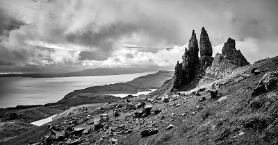 Only a few cars dotted the parking lot to the trail-head. Equipped with Tripod and a pair of walking sticks, B, AJ and TwoSon started on the gravel path up the mountain. A cool wind pushed and prodded them as they progressed up the rocky, muddy trail, but soon their destination was in sight: an unusual rock formation protruding from the mountain, bathed in wind and mist. It was The Old Man of Storr.