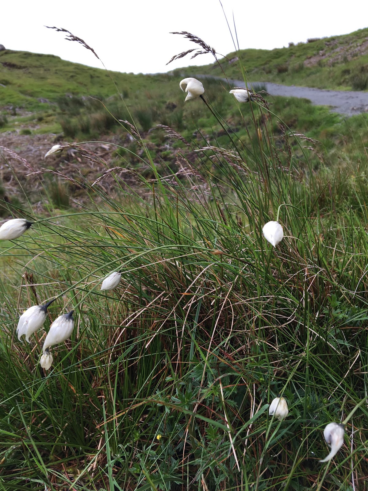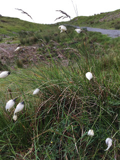 On the way up, AJ took pictures of flowers, known and unknown to her. One, the bog cotton (Eriophorum angustifolium), had tufts of cotton-like material at the end of stems, dotting the hillside and lining the trail all the way up. Beyond a sheep gate and a herd of sheep, the trail grew steep, with ledges of stones to serve as stairs in the mucky peat ground. Loch Leathan, filled with rocky islands, and the Sound of Raasay lay glistening in the sun far below them.