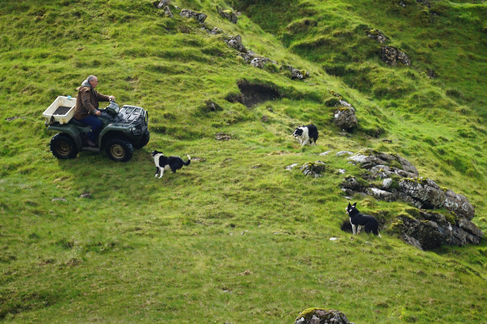 While B was busy getting the perfect shot of The Old Man of Storr, AJ and TwoSon explored the area. A herd of sheep, pressed close together and running for their lives crossed the path below them, followed by a shepherd on a 4 wheel ATV and his four sheep dogs.