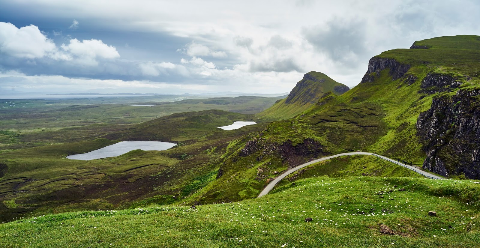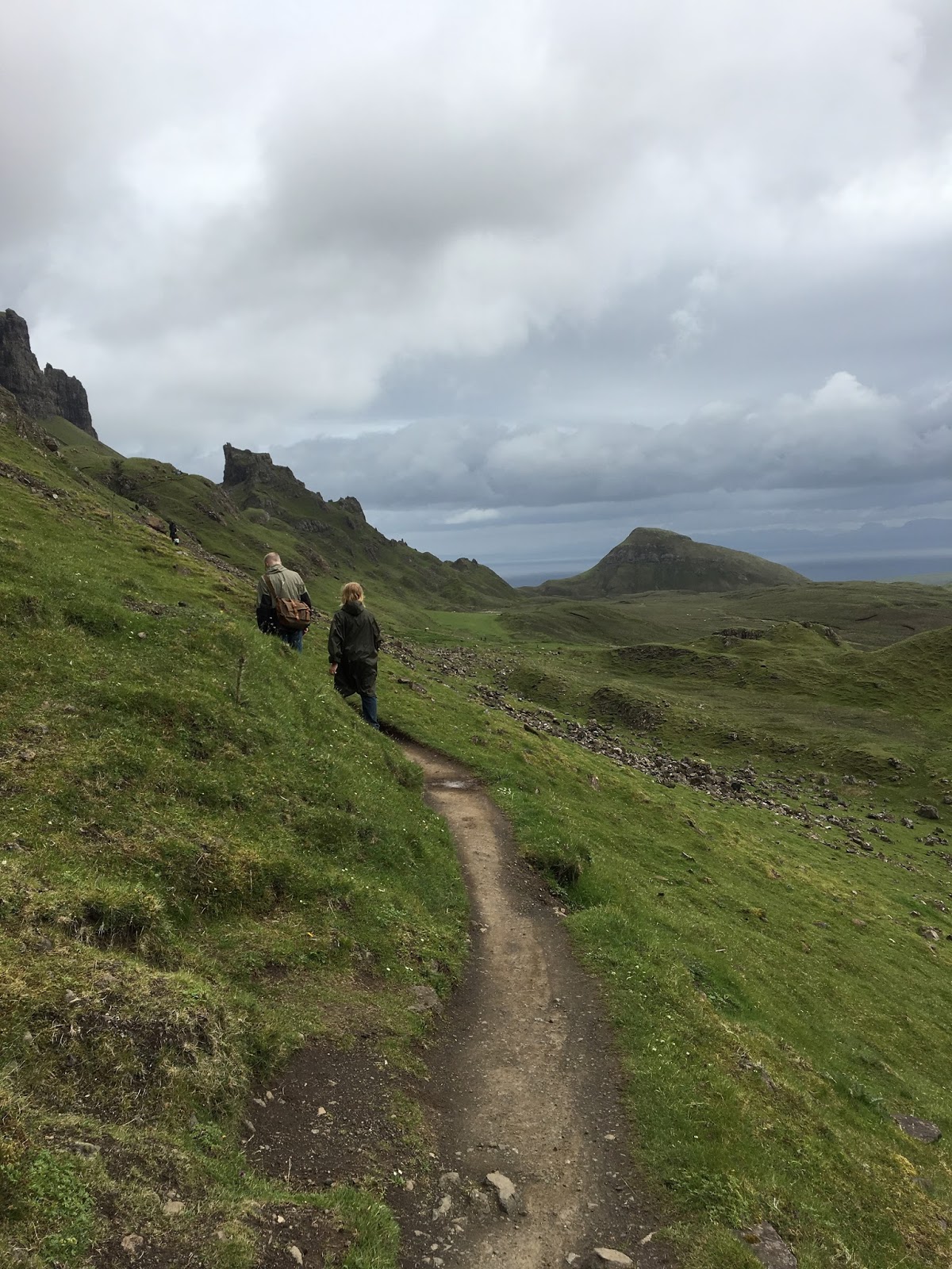 Their next stop was at the Quiraing, a scenic area full of towering mountains with expansive views of the sheep valley below and surrounding lochs. This time they were too late to get a good parking spot and were forced to park off the one-lane, two-way road, in the mud.