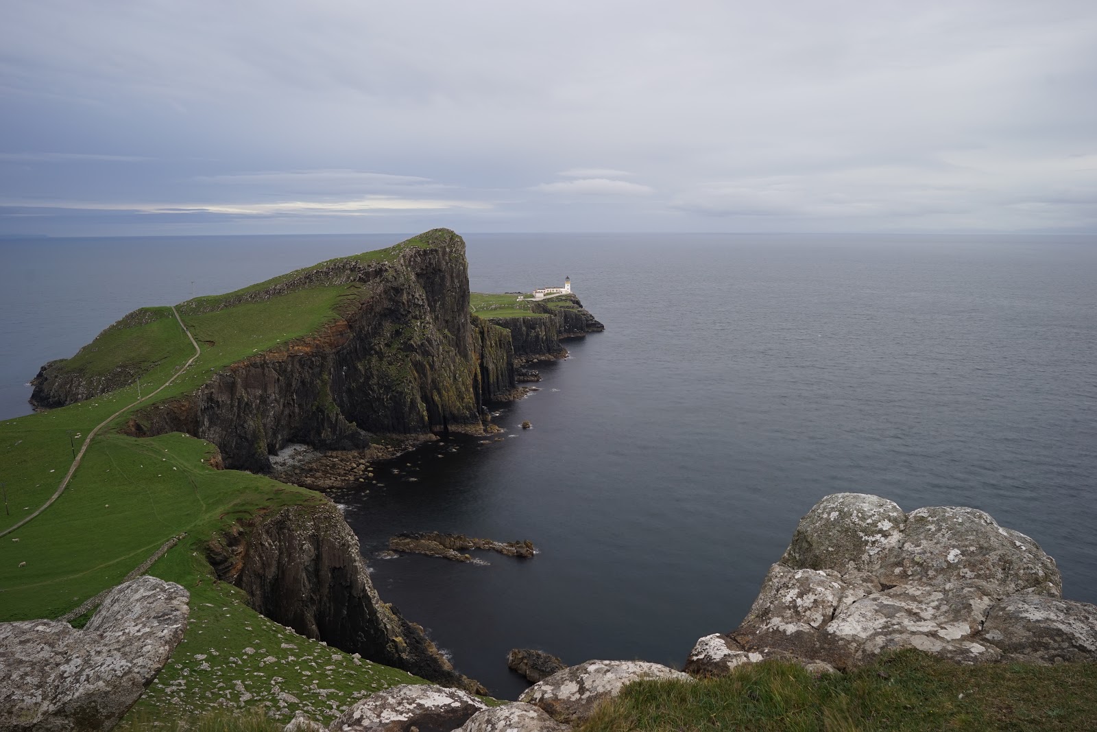 They passed regular cows, sheep in the road, cute white houses and farms to Neist Point Lighthouse where 3-4 RVs had managed to travel (the roads were very narrow) to stay the night. B and Tripod found a spot on a cliff overlooking the lighthouse and peninsula while AJ and TwoSon took a hike to the lighthouse, through sheep pastures. By then, they had become accustomed to watching out for “cocoa puffs” or sheep leavings everywhere they went.