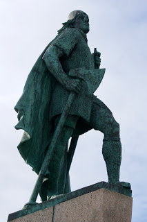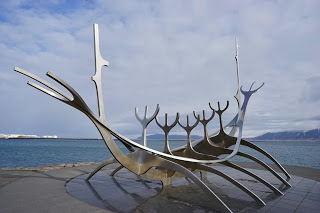 On the way into Reykjavik, they were rerouted a few times before finding a parking spot along a quaint street just a few blocks from Hallgrímskirkja, the Lutheran church built to resemble a Viking longboat. In the nearby bakery, Brauð*, Bjorn bought two sticky buns from three red-headed bakers, brought them to the car and shared them with Snorri as Astrid gnawed on a protein bar. After their snack, they walked up to the church, admiring the unique architecture, and the Leif Erikson statue sitting victoriously in front of it. A short, cool, windy walk down to the ocean shore, past small houses, tattoo and vape shops, led them to the popular silver long-boat sculpture, The Sun Voyager.