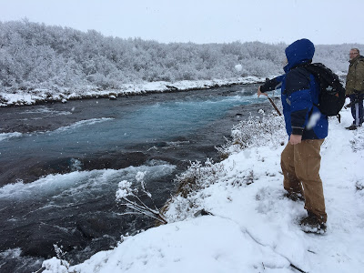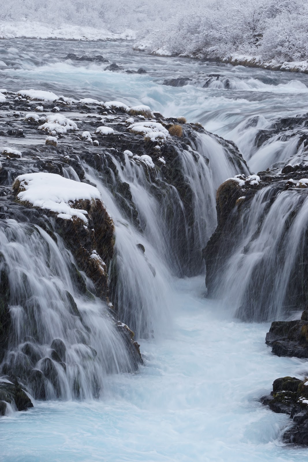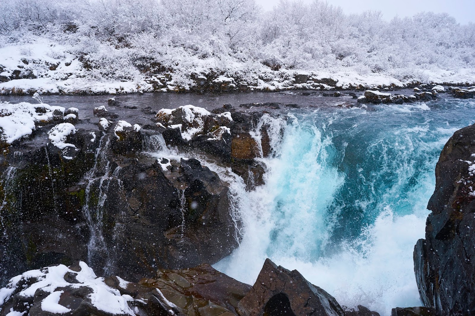 As they drove to the next stop, it was starting to snow harder, but they pressed on. They parked in a small lot off the highway 37 (Bruaurfoss Waterfall Official Parking Lot), carefully crossed a cattle-grate and followed footprints in the snow that lead to barely visible white path, past a group of small but hearty horses who didn’t acknowledge the hikers and went about searching for nibbles under the snow. They trudged by a stream for about a half mile, their feet sinking in the snow-covered mud, then made their way through high shrubs, then up a ladder-like stile over a fence and came out close to a cliff overlooking the rapidly running water. B stopped at the first waterfall as the lagging Astrid and Snorri caught up.
