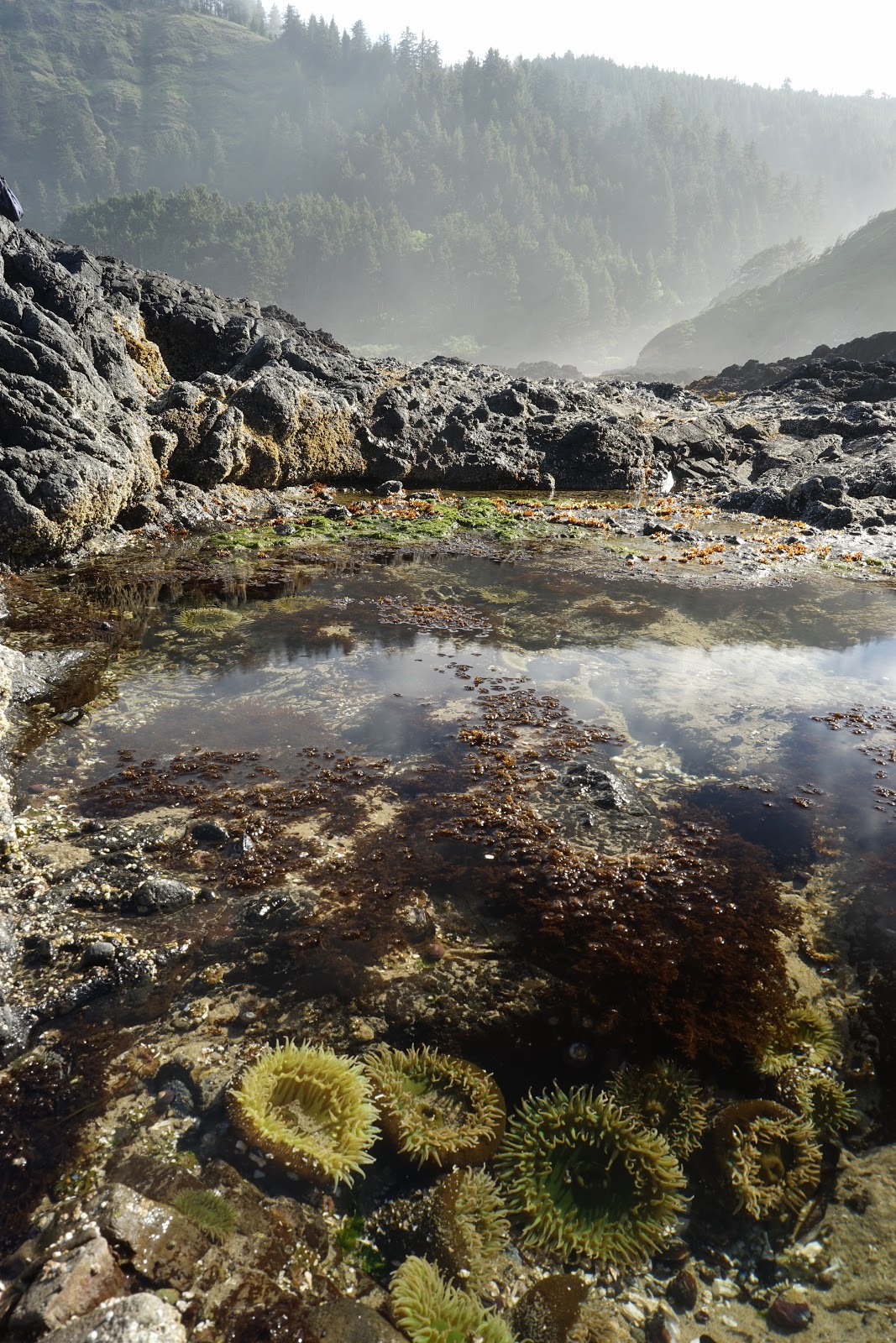 The morning sun was strong when they arrived back at Thor’s Well, a dozen tourists were walking gingerly over the volcanic and igneous rocks, combing the tidal pools for photographic fodder. Astrid had put on all her long sleeves and a hat and found a spot to sit and write and watch.