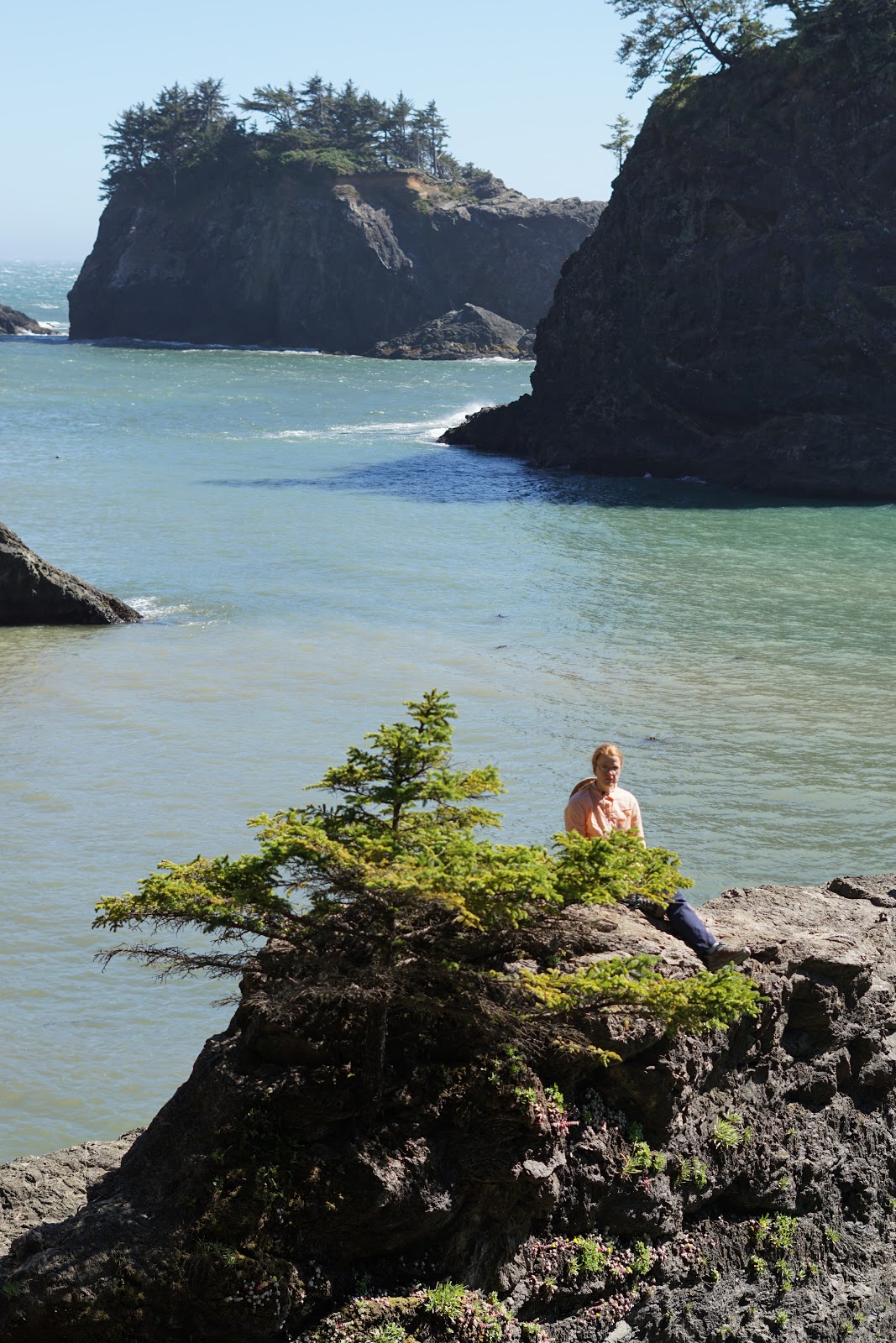 The first stop was at Secret Beach, down a trail through exquisite woods, streams, and moss everywhere. They came out on a ledge of rock overlooking a beach squeezed between two pillars of rock.