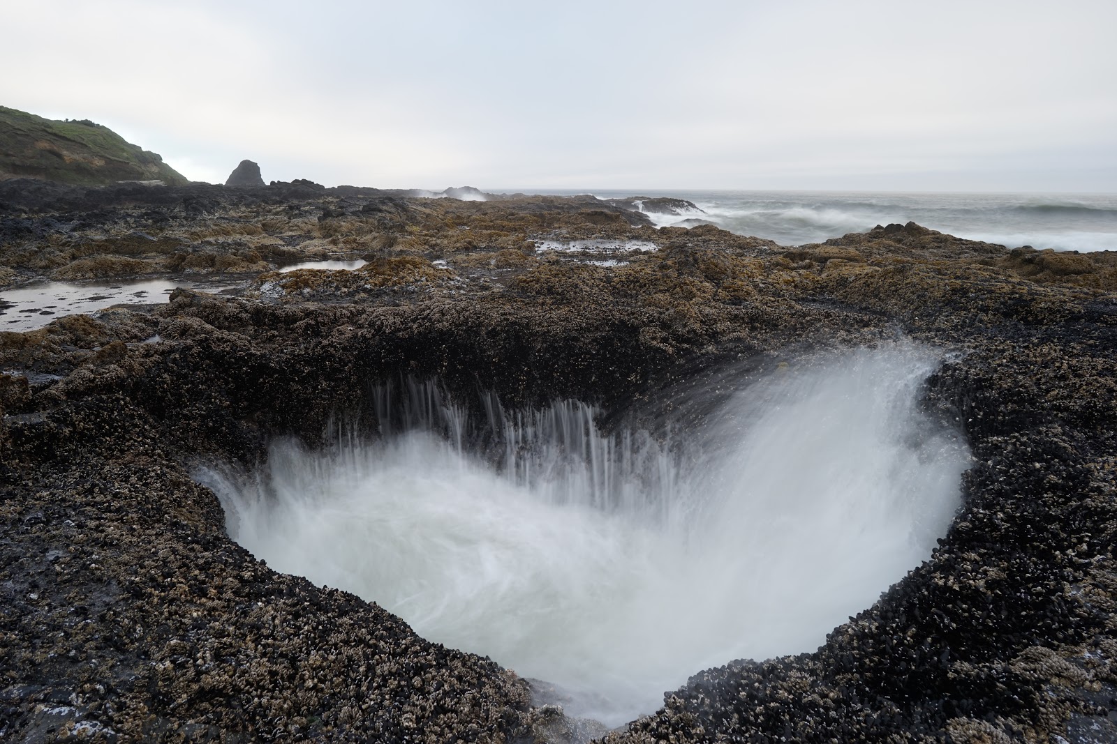 After settling into their AirBnB overlooking the ocean just outside Yachats, Oregon, Astrid and Bjorn drove into the town to eat clams and fish ’n chips at Luna Sea Restaurant, then headed out to Thor’s Well at Cape Perpetua Scenic Area.