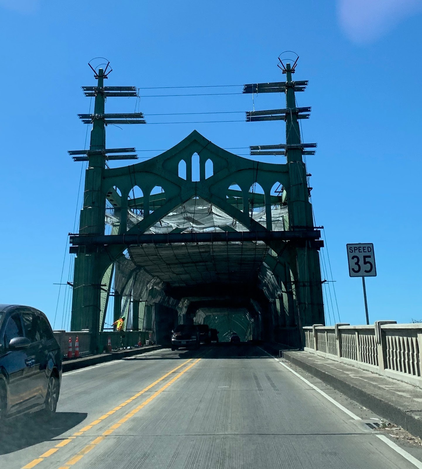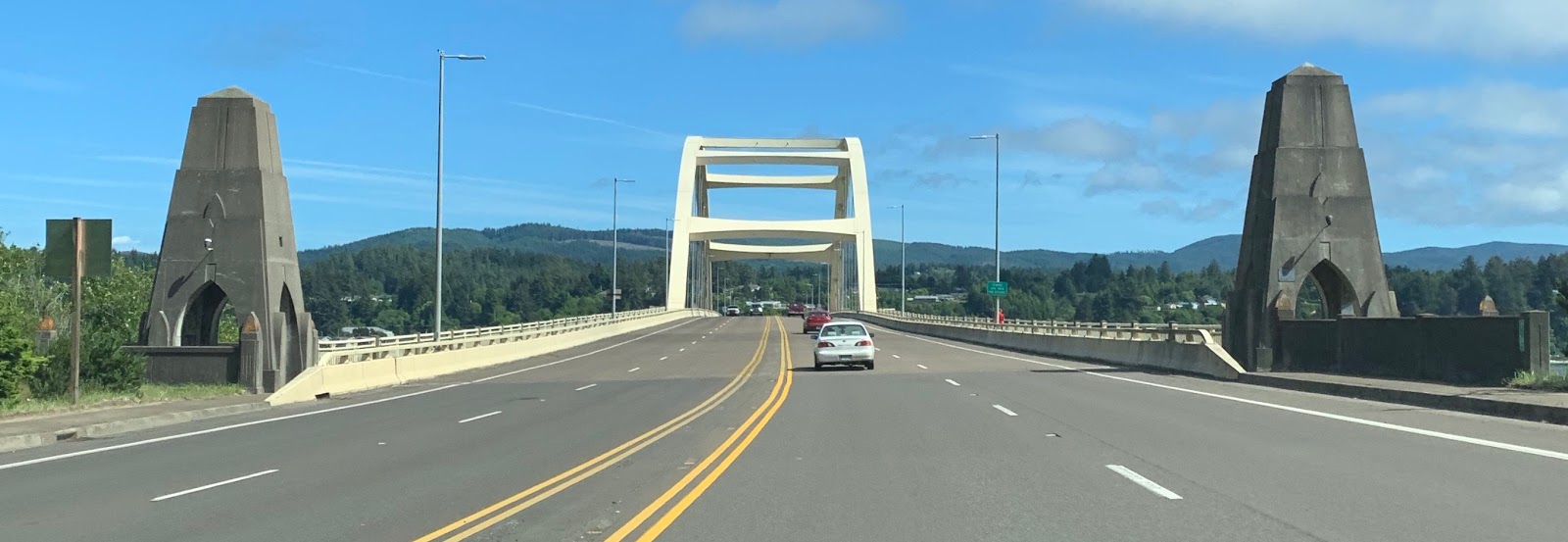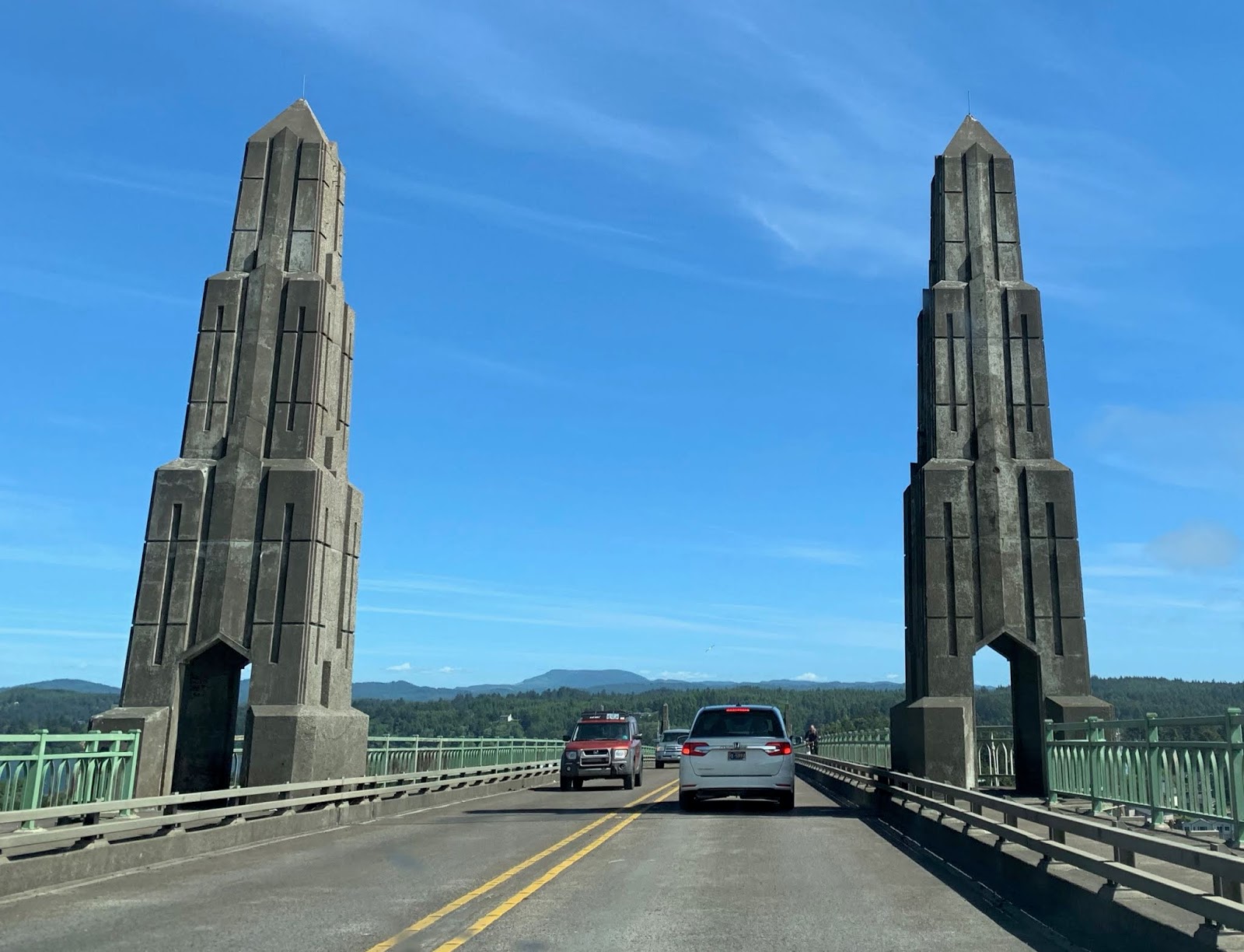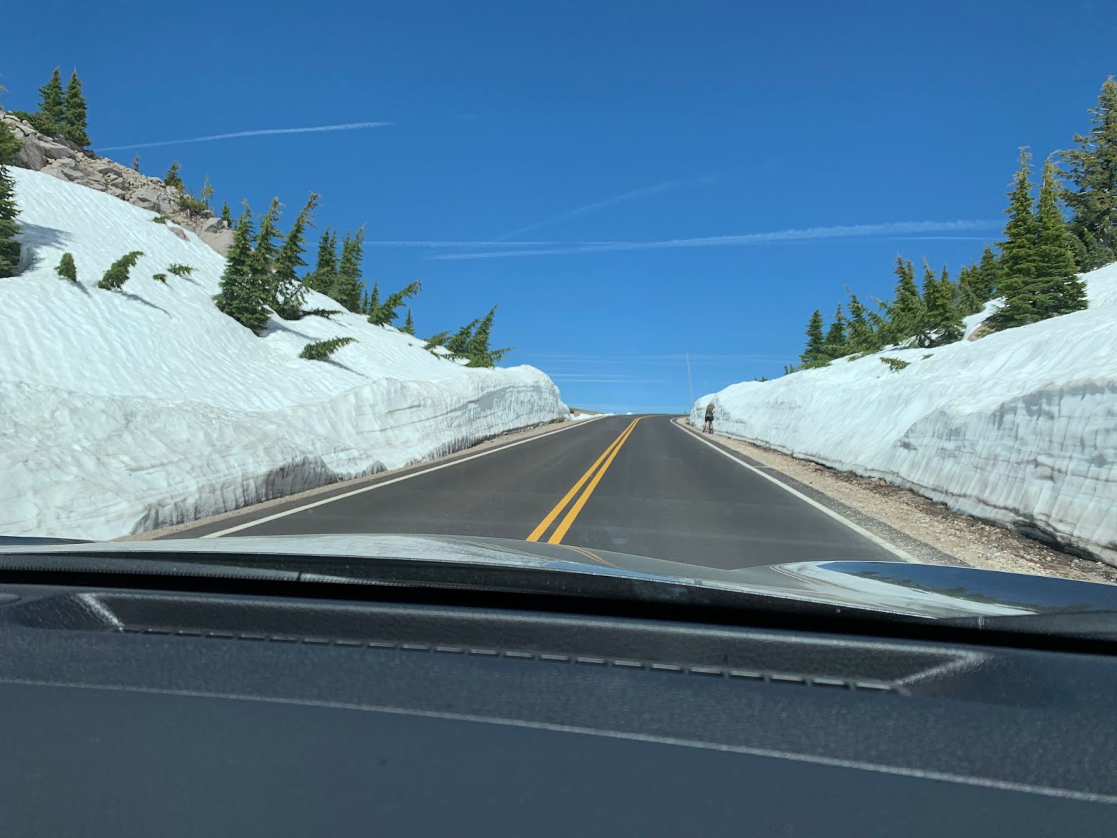 The two-hour drive to lunch through winding roads thread through mountains and small towns back into Oregon, always a tree lined “V” vista in front of them in a natural forced perspective. Oregon roads often lead the traveler over bridges, and many of the bridges had decorative columns at the ends, in the art-deco or gothic style. Every little town they passed through had a Family Dollar-type store, a Mom and Pop Coffee shop or coffee drive-through, and a dispensary. The farther north they traveled, the towns grew more scarce, but patches of snow more abundant, and fused into mountains of snow as they followed the road to Crater Lake National Park.