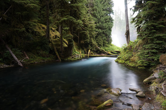 Still misting, they stopped at Sahalie and Koosah Falls Trail, near MacKenzie Bridge, Oregon and walked along a crystal-clear stream that jumped down precipices in a few water falls. The colors surrounding them were vivid; a dozen shades of green leaves, aqua-blue water with white froth, brown-red tree trunks, grey stones, clay-red dirt; all the objects’ hues popping vibrant against the dull, mist-filled sky.