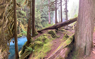 When they parked and got out at Proxy Falls Trailhead in Three Sisters Wilderness in the Willamette National Forest, it was still misting, but lightly. After using the restrooms, and paying, they set off on a wondrous trail flanked by volcanic rock, giant, moss-draped trees and dark green pines. After hazarding a steep downhill trail into a ravine, over fallen trees, they reached their destination: Proxy Falls.