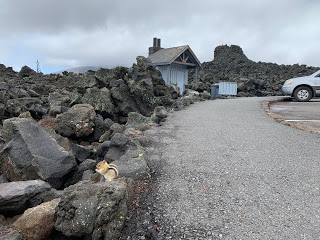 They stopped at the Dee Wright Observatory to appreciate the view and eat their lunch, parking the car in a lot looking out over a field of black lava rock punctuated by a tower built of the stones.