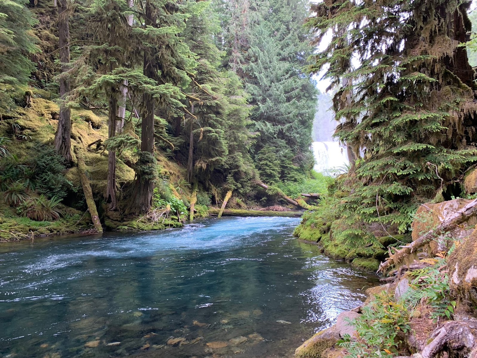 Still misting, they stopped at Sahalie and Koosah Falls Trail, near MacKenzie Bridge, Oregon and walked along a crystal-clear stream that jumped down precipices in a few water falls. The colors surrounding them were vivid; a dozen shades of green leaves, aqua-blue water with white froth, brown-red tree trunks, grey stones, clay-red dirt; all the objects’ hues popping vibrant against the dull, mist-filled sky.