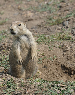 Because they might be looking for much bigger animals, i.e. bison, a visitor could drive right by the prairie dog towns and not know it until one of the little critters runs across the road in front of them. The “towns” consist of plains and small hills pock-marked with little eruptions of dirt surrounding prairie dog holes. The little vermin usually sit on their door stoop, looking around, chirping gossip to their neighbor doing the same, or grooming. Funny little things.