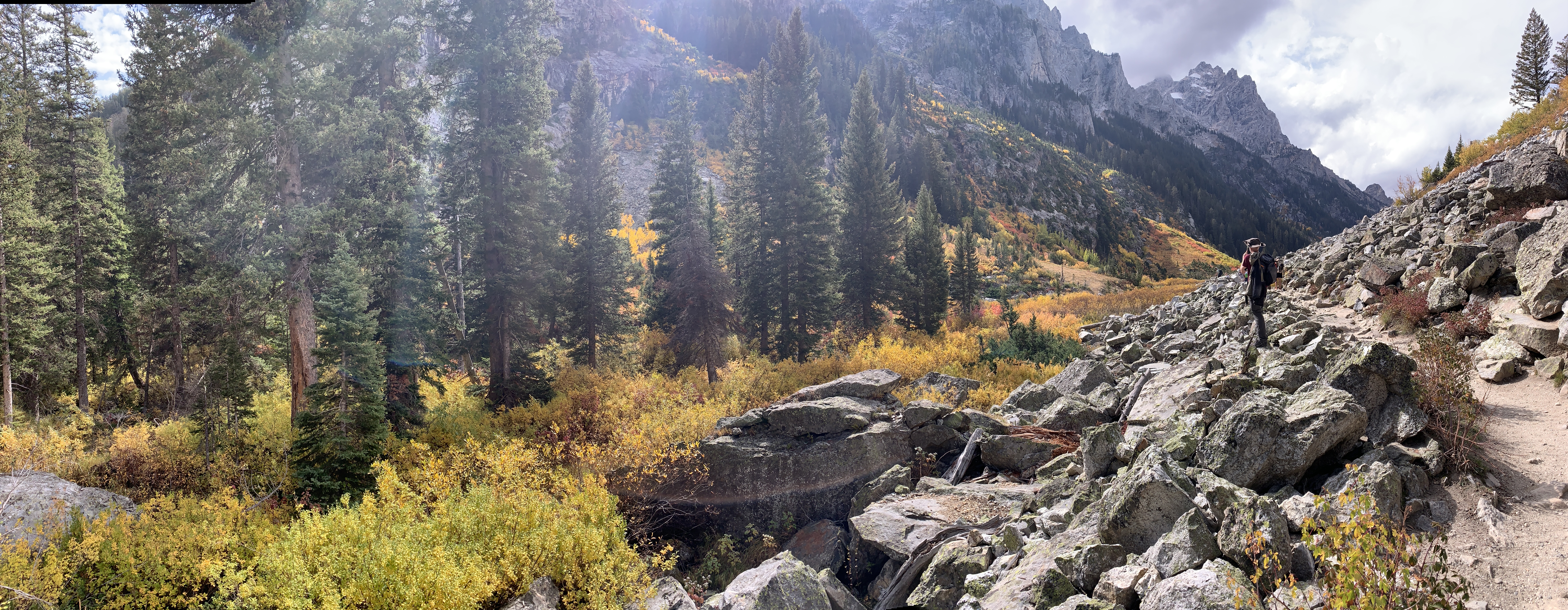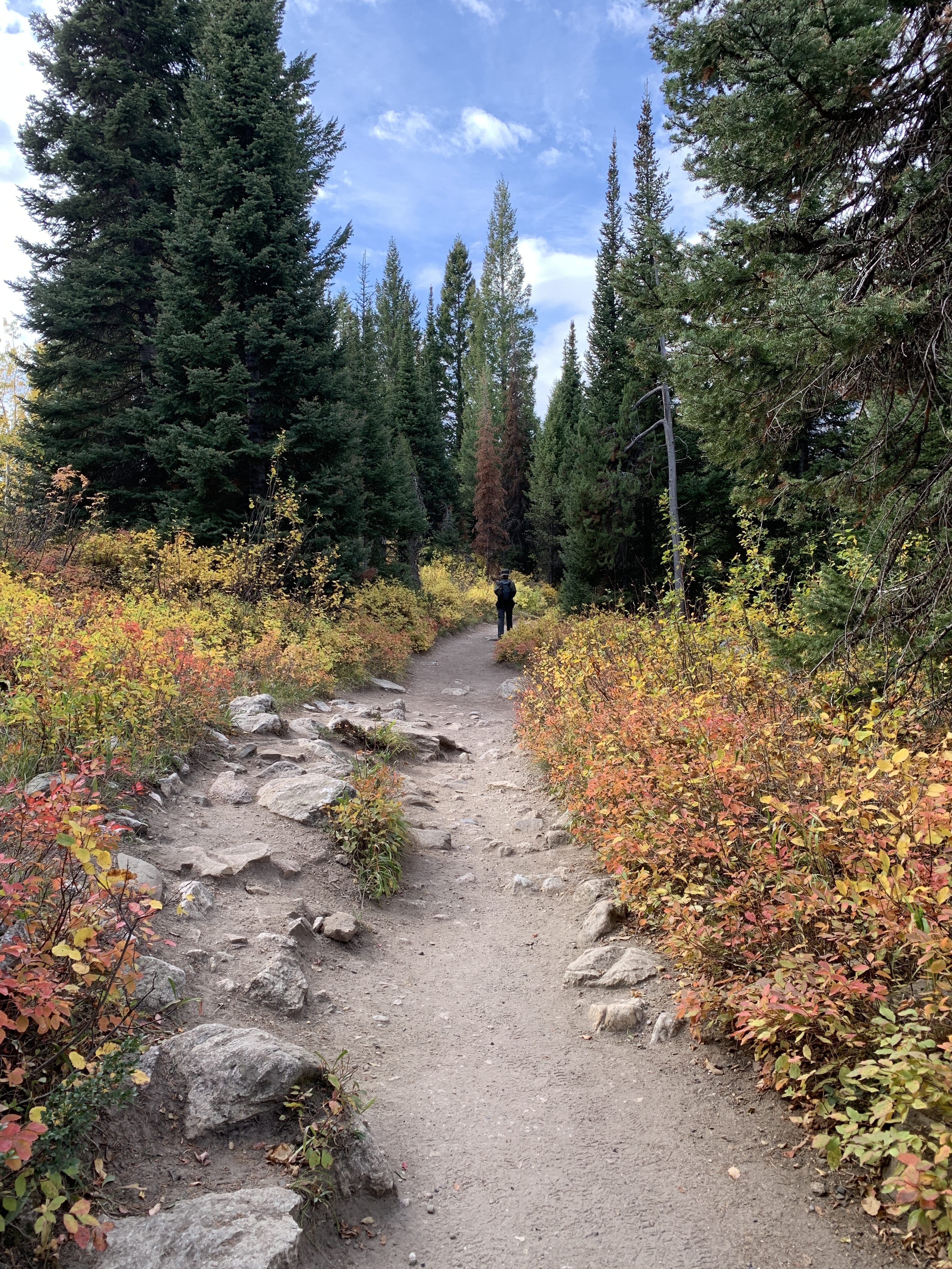 Because it was a beautiful autumn Sunday in the Tetons, they had to park half a mile along the road to the Jenny Lake Visitor’s Center, and Cascade Canyon trailhead. There, for a fee, visitors can take a seasonal water taxi across Jenny Lake and cut two miles from the hike to the best views. The dock to the shuttle was crammed with people and the wait to get on it predicted to stretch into hours, so Astrid and Bjorn chose to spend that time walking the extra two miles around Jenny Lake to the trail to Cascade Canyon.
