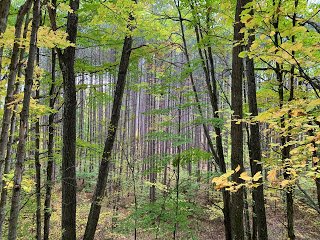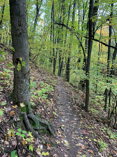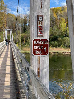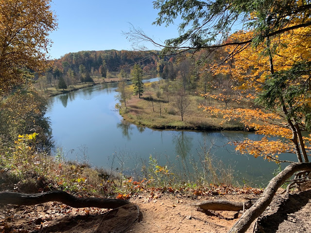 As she walked along the path, back to Red River Bridge, she was tired in body, but rested in soul. The MRT side of the loop trail was, at every turn, magnificent. The NCT was a pleasant walk up and down wooded hills, but it was the more visually tame trail. The MRT lead along beautiful tree-backed meadows, along ravines with streams snaking the bottoms, treacherously close to the edge of a high bluff overlooking the elegant curves of the blue Manistee River.