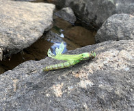Astrid struggled and wrestled with dressing in the tiny, one-man tent, but eventually sorted herself out, broke down the tent, repacked her backpack, retrieved the food bag from the tree and dragged her tent tarp to sit on the ridge overlooking the vociferous stream and ate some cheese, bologna and nuts while she heated water for instant coffee on her backpacking stove.