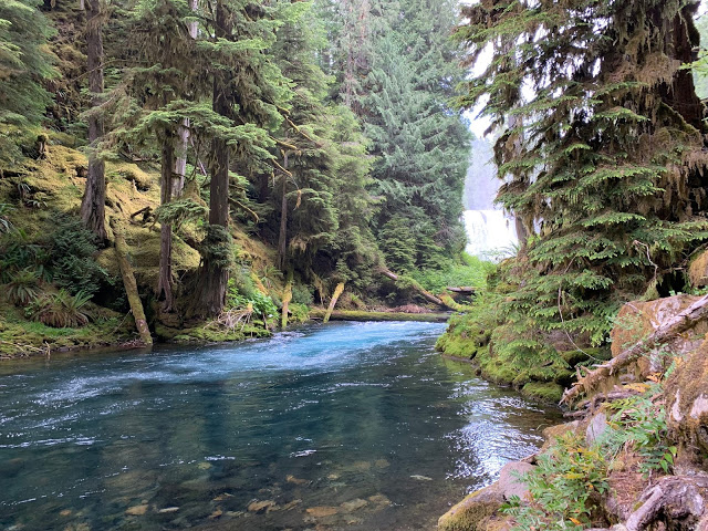 When they parked and got out at Proxy Falls Trailhead in Three Sisters Wilderness in the Willamette National Forest, it was still misting, but lightly. After using the restrooms, and paying, they set off on a wondrous trail flanked by volcanic rock, giant, moss-draped trees and dark green pines.  After hazarding a steep downhill trail into a ravine, over fallen trees, they reached their destination: Proxy Falls.