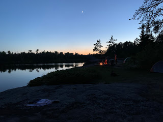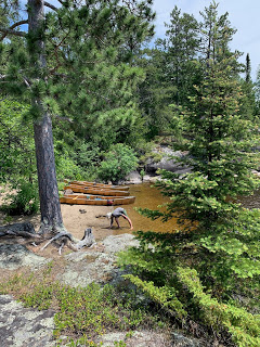 Just in time to disappoint a few other canoeing parties searching for a campsite, G2 made it to site #1323, a 5-star campsite with a sand beach, and campsite perched high on top of flat rocks overlooking an expanse of Lake Insula. This Best Campsite Ever would be their home for the next two days.