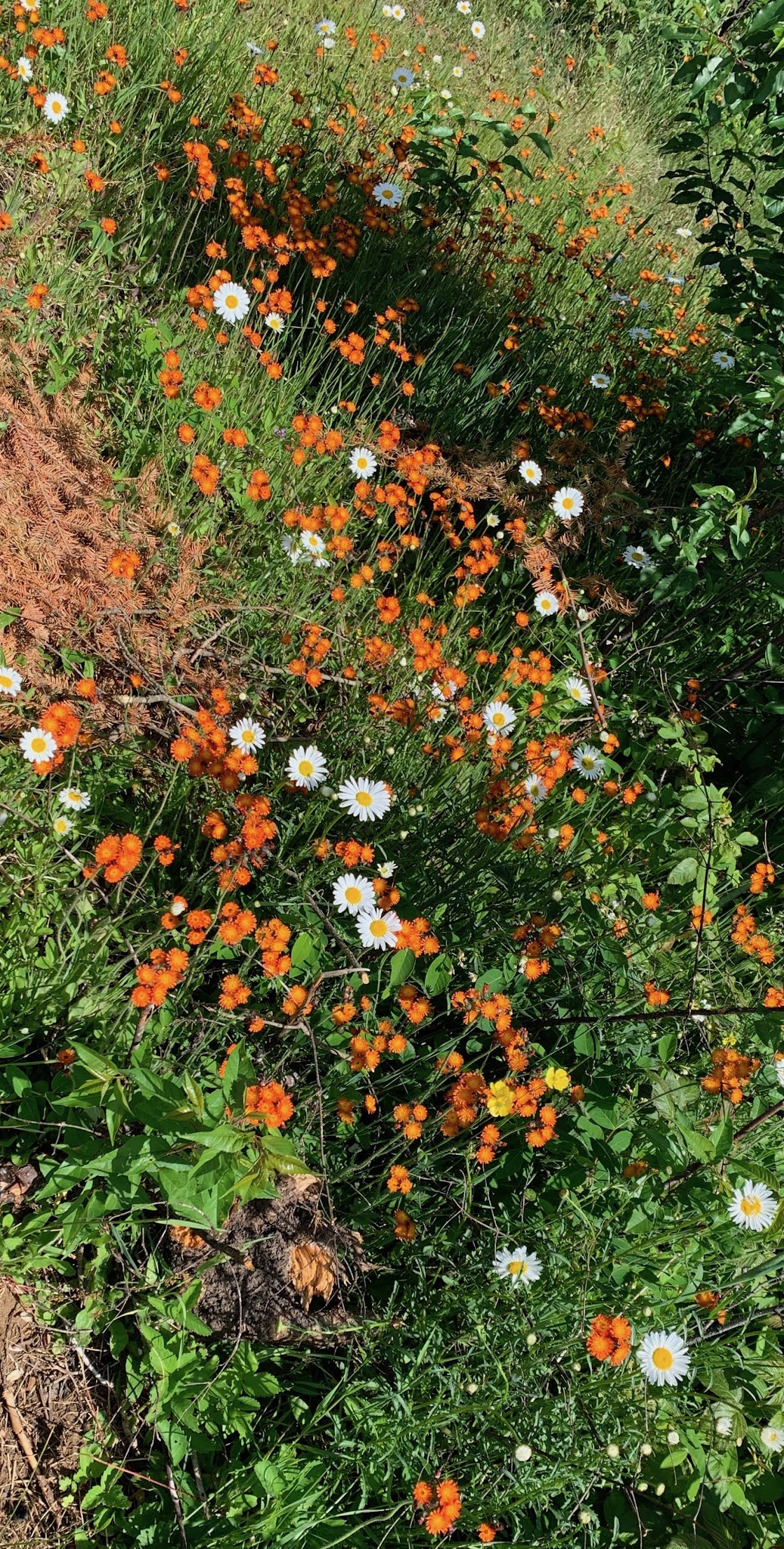Astrid picked a spot for her tent which backed up to a patch of oxeye daisies, but the whole campsite was sprinkled with wildflowers–orange hawkweed (Hieracium pilloseloides), tall buttercup (Ranunculus acris) and low tiny white flowers. The afternoon sun was strong on the front of the site, warming the boulders, which made it good for drying socks.